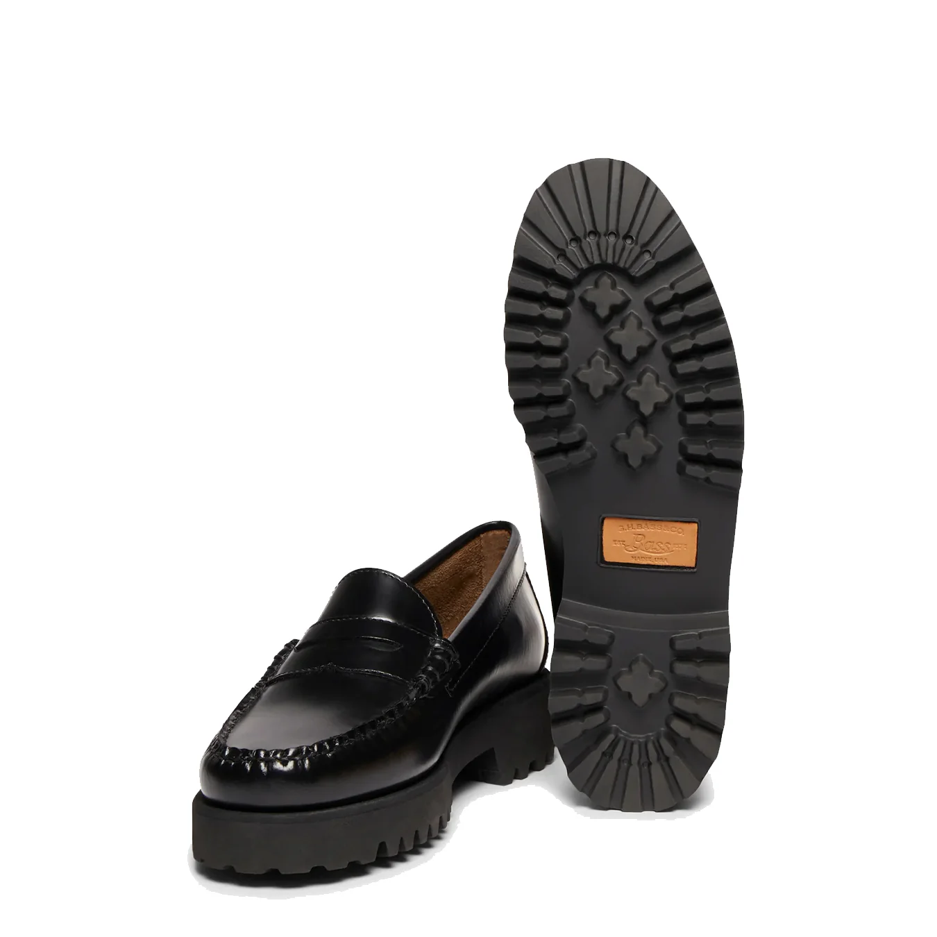 Statement loafers, the Weejuns 90s are a timeless classic with a youthful touch. Featuring black polished leather uppers in a slip on design, hand stitched seams in tonal waxy thread, leather heel sock with gold foil branding, finished with a chunky yet super lightweight EVA outsole.